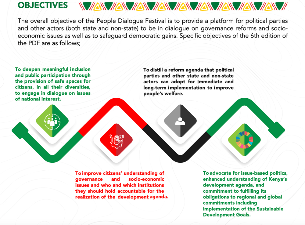 People are at the heart of PDF. Citizens from all walks of life and leaders voluntarily meet on level terms focused to dialogue on governance reforms, socio-economic issues, and to safeguard democratic gains. Over the last four years, PDF has attracted tens of thousands of participants including elected leaders, national and county government officials, political parties, civil society organizations, professional associations, private sector, academia, trade unions, media, women rights’ organizations, youth-led & youth-serving organizations, community-based organizations international democracy support organizations and representatives of diplomatic missions.