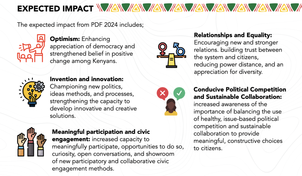 PDF is uniquely relevant as it ensures that enhanced dialogue goes beyond the political elite and accommodates gender equality, the inclusion of youth, minorities, civil society organizations, and other non-traditional actors like citizen movements in a political decision-making process. Participation has steadily grown from less than 1,000 in 2019 to over 8,000 in 2023 attracting a diverse audience including elected leaders, national and county government officials, political parties, civil society organizations, professional associations, private sector, academia, students, trade unions, media, artists, women rights’ organizations, youth-led & youth-serving organizations, community-based organizations international democracy support organizations and representatives of diplomatic missions.